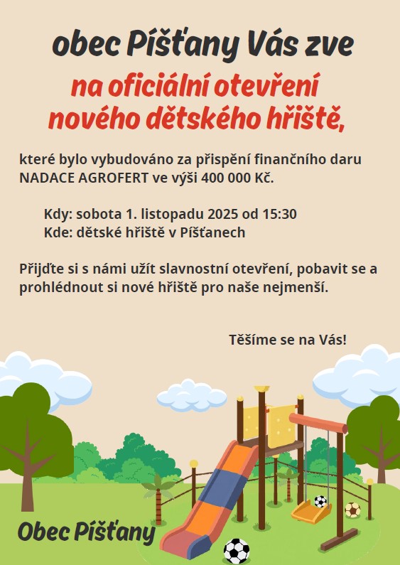 Dne 1.11.2025 proběhlo oficiální otevření nového dětského hřiště, které bylo vybudováno za přispění finančního daru NADACE AGROFERT ve výši 400 000 Kč.