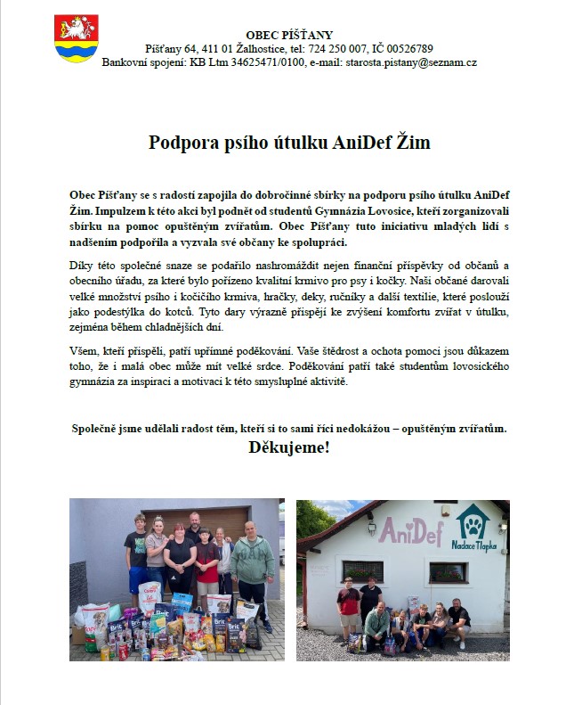 Obec Píšťany se připojila k akci "Sbírka pro zvířecí útulek AniDef Žim" pořádanou Gymnáziem Lovosice.