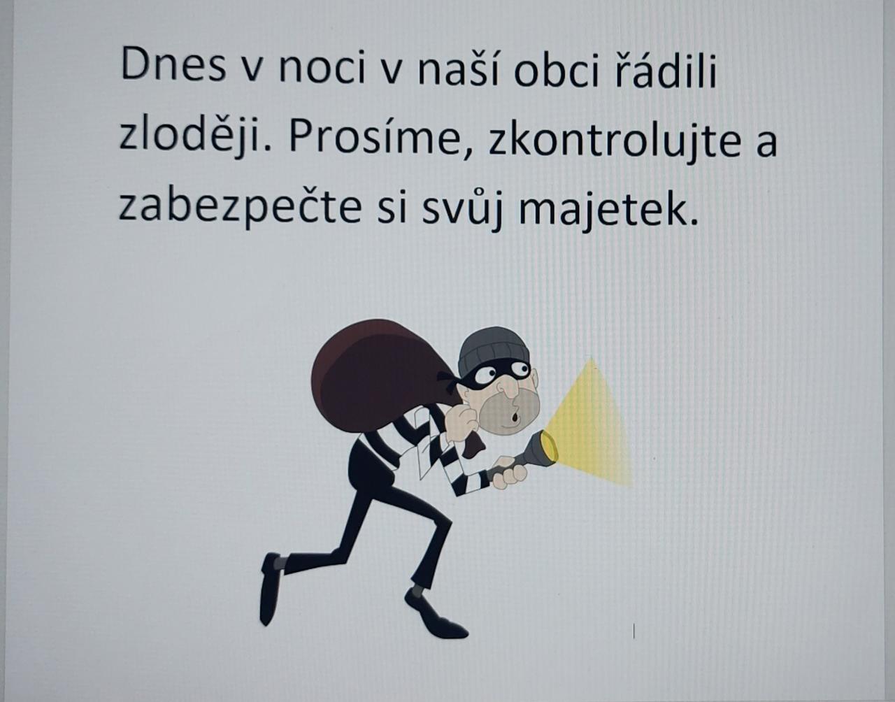 Dnes v noci v naší obci řádili zloději. Prosíme, zkontrolujte a zabezpečte si svůj majetek.
